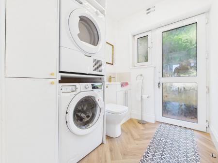 A practical utility/cloakroom with low level flush WC, vanity wash hand basin with storage below and plumbing for both a washing machine and dryer. A fitted storage cupboard and a uPVC obscure double glazed door to the rear garden.