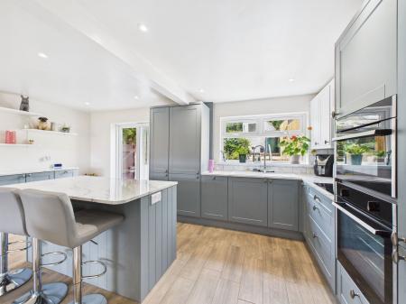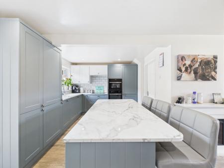 This stunning, modern open plan kitchen/dining/living space is perfectly designed for contemporary living and entertaining. The stylish kitchen features a comprehensive range of wall, base and drawer units topped with sleek square edged work surfaces. A 1 bowl composite sink with drainer, integrated eye level double electric oven with grill and a four ring induction hob with extractor hood are provided. Additional integrated appliances include a fridge freezer, dishwasher, and concealed bin store. A generous freestanding kitchen island and larder offer exceptional storage.