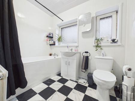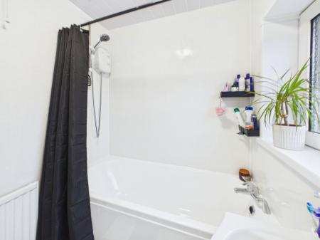A spacious bathroom fitted with a low level WC, pedestal wash hand basin and a panelled bath with overhead shower and protective glass screen. Finished with tiled walls, uPVC obscure double glazed window and a gas central heating radiator.