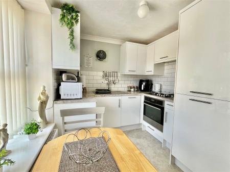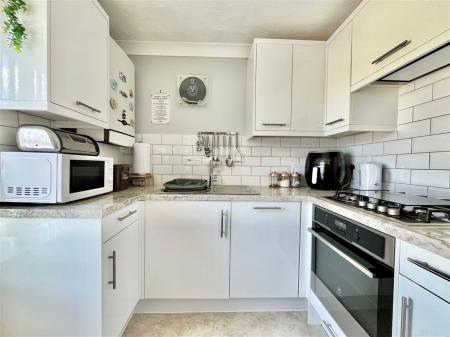 KITCHEN- 2.75m x 2.17m (9'0" x 7'1") A modern fitted kitchen boasting a range of overhead, base and drawer units with square edged work surfaces above. A 1 bowl stainless steel sink and drainer unit, a range of integrated appliances such as an electric single oven with grill integrated, a four ring gas hob with extractor hood above and an integrated fridge freezer. Complimentary tile backlash, a wall mounted combination boiler, a uPVC double glazed window and space for a breakfast table.