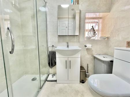 SHOWER ROOM A contemporary shower room comprising a three piece suite of a low level flush WC, a vanity wash hand basin with fitted storage below and a walk in double shower unit. Complimentary modern tiling, a mirror fronted medicine cabinet, a uPVC obscure double glazed window and a chrome heated towel rail.