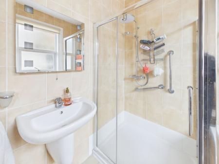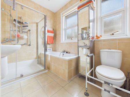 BATHROOM A spacious family bathroom comprising a four piece suite of a low level flush WC, a wall mounted wash hand basin, a bath unit and a walk in double shower unit. Tiled walls, two uPVC obscure double glazed windows and a gas central heated radiator.