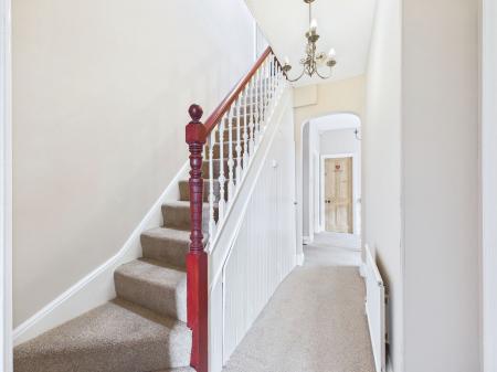ENTRANCE HALLWAY A wide and welcoming entrance hallway with wonderful high ceilings, doors leading to the adjoining rooms, stairs rising to first floor, an understairs storage cupboard, picture rails, uPVC double glazed window and a gas central heated radiator.