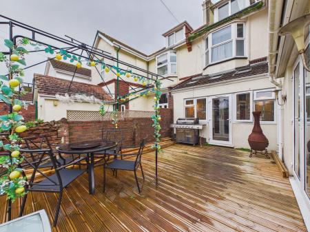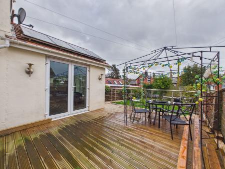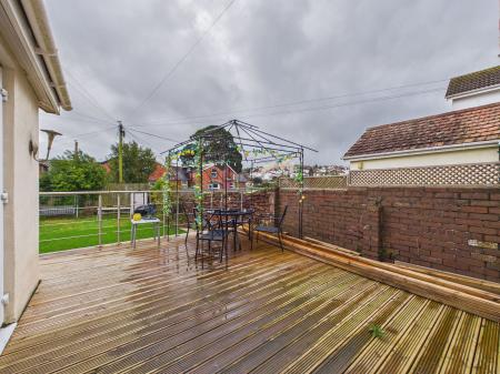 OUTSIDE A beautifully landscaped rear garden featuring an expansive decking area perfect for alfresco dining and entertaining stepping down to a generous lawned area, ideal for family enjoyment and outdoor relaxation.