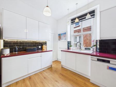 KITCHEN - 3.68m x 3.67m (12'0" x 12'0") A modern kitchen boasting a range of overhead, base and drawer units with roll edged work surfaces above. A 1 1/2 bowl porcelain sink and drainer unit, a range style cooker with a five ring gas hob. Space and plumbing for a dishwasher and fridge freezer, complimentary tile backsplash, uPVC double glazed window and a door leading into:-