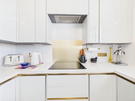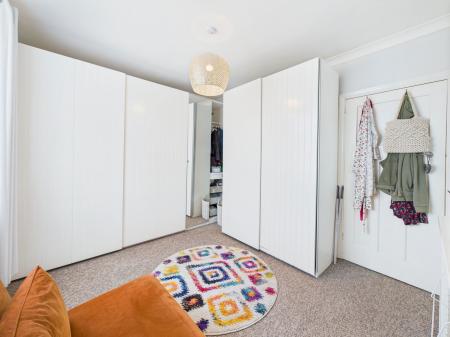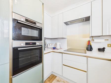 KITCHEN - 3.7m x 2.7m (12’1 x 8’6) Wren fitted luxury integrated kitchen comprising Quartz sink unit with cupboards below; adjoining work tops with cupboards and drawers under including carousel and pull out drawers. Inset eye level oven and microwave above. Integrated Zanussi fridge and freezer. Bosch induction hob. Concealed extractor. Concealed dishwasher. Splashbacks. Fitted shutters. uPVC double glazing. Full height central heating radiator. Natural wood effect flooring. uPVC double glazing.