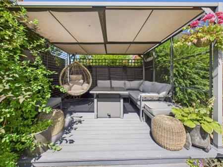 REAR GARDEN Stunning private gardens with two decked seating areas and patio with lawn and mature shrubs providing high levels of privacy.