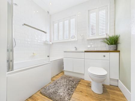 BATHROOM Recently fitted luxury suite comprising shower bath with glass screen with mains shower. Vanity basin and close coupled WC. Linen cupboard. uPVC windows and shutters. Chrome radiator.