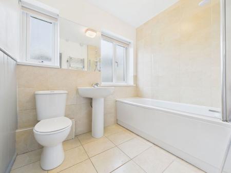 BATHROOM White three piece suite comprising panelled bath with electric shower and screen. Pedestal wash basin, low level WC, chrome heated towel rail and uPVC double glazing.