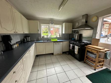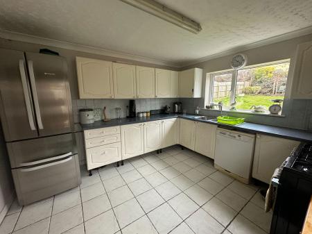 KITCHEN - 3.6m x 3.3m (11'9" x 10'9") MAX. Fitted with a range of white wood grain effect wall and base units with work surface over. Plumbing for dishwasher. Gas cooker point. Tiled floor. Space for fridge/freezer. Double glazed door and double glazed window to rear.
