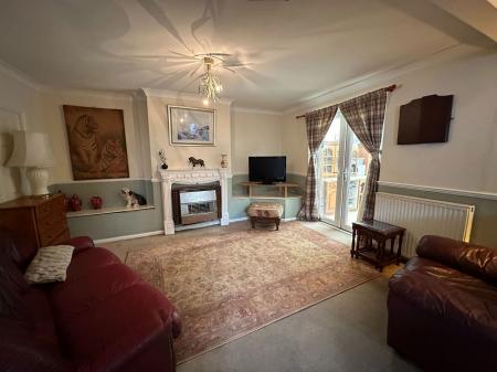 LOUNGE/DINER - 7.2m x 4.4m (23'7" x 14'5") MAX. A spacious room with decorative fireplace and gas fire. Fold back doors to sitting room. Dado rail, two radiators and double glazed window. Walk in store cupboard. Door to:-