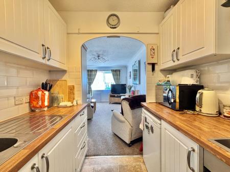 LIVING ROOM – 4.62m x 3.14m (15'1" x 10'3") A spacious and light filled living room enjoying pleasant views over the communal gardens. This space includes TV and internet points, a night storage heater and large double glazed windows. An open archway provides seamless access to the adjoining kitchen.