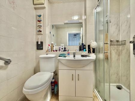 SHOWER ROOM Comprising a modern three piece suite with a low level WC, vanity wash basin with storage below and a walk in shower enclosure. Complemented by tiling and wall panelling, extractor fan and a chrome heated towel rail.