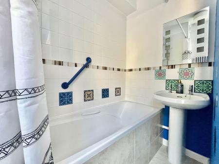 BATHROOM An L shaped family bathroom comprising a three piece suite of a low level flush WC, a pedestal wash hand basin and a panned bath unit with shower attachments above. Part tiled walls, a uPVC obscure double glazed window and a chrome heated towel rail.