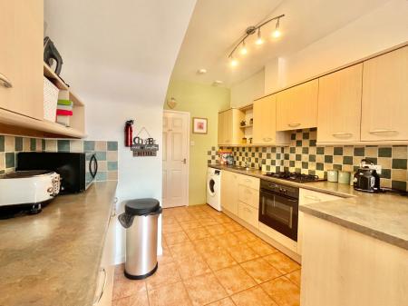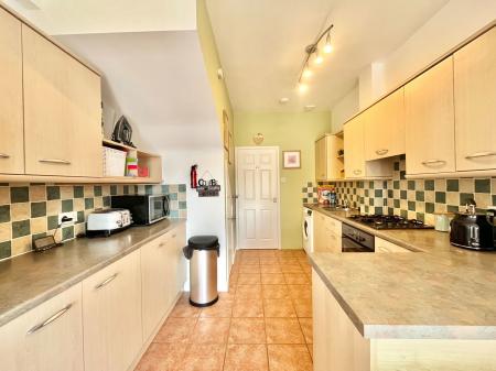 KITCHEN/DINER - 6.69m x 2.95m (21'11" x 9'8") A uPVC double glazed front door opening into a bright and spacious kitchen/diner perfect for entertaining. The kitchen boasts a range of overhead, base and drawer units with roll edged work surfaces above. A 1 1/2 bowl stainless steel sink and drainer unit, an electric single oven with grill integrated and a four ring gas hob with extractor hood above. Space and plumbing for a washing machine, dishwasher and fridge freezer. Complimentary tile backsplash and flooring, a deep understairs storage cupboard and a gas central heated radiator.