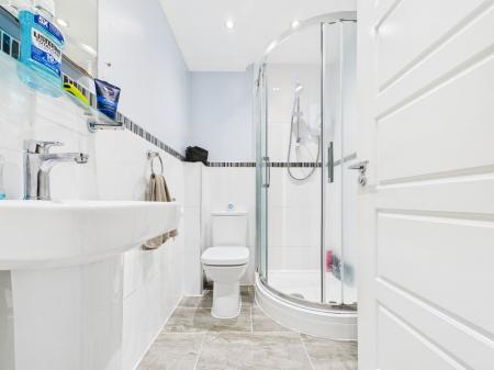EN-SUITE A contemporary en-suite shower room featuring a low level WC, pedestal wash hand basin and a corner walk in shower. Additional highlights include tiled walls, an extractor fan and a chrome heated towel rail.