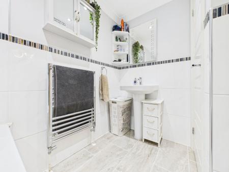 BATHROOM A modern family bathroom comprising a panelled bath with shower attachments above, low level WC, pedestal wash basin, extractor fan, chrome heated towel rail, complementary tiling and a deep built in storage cupboard.