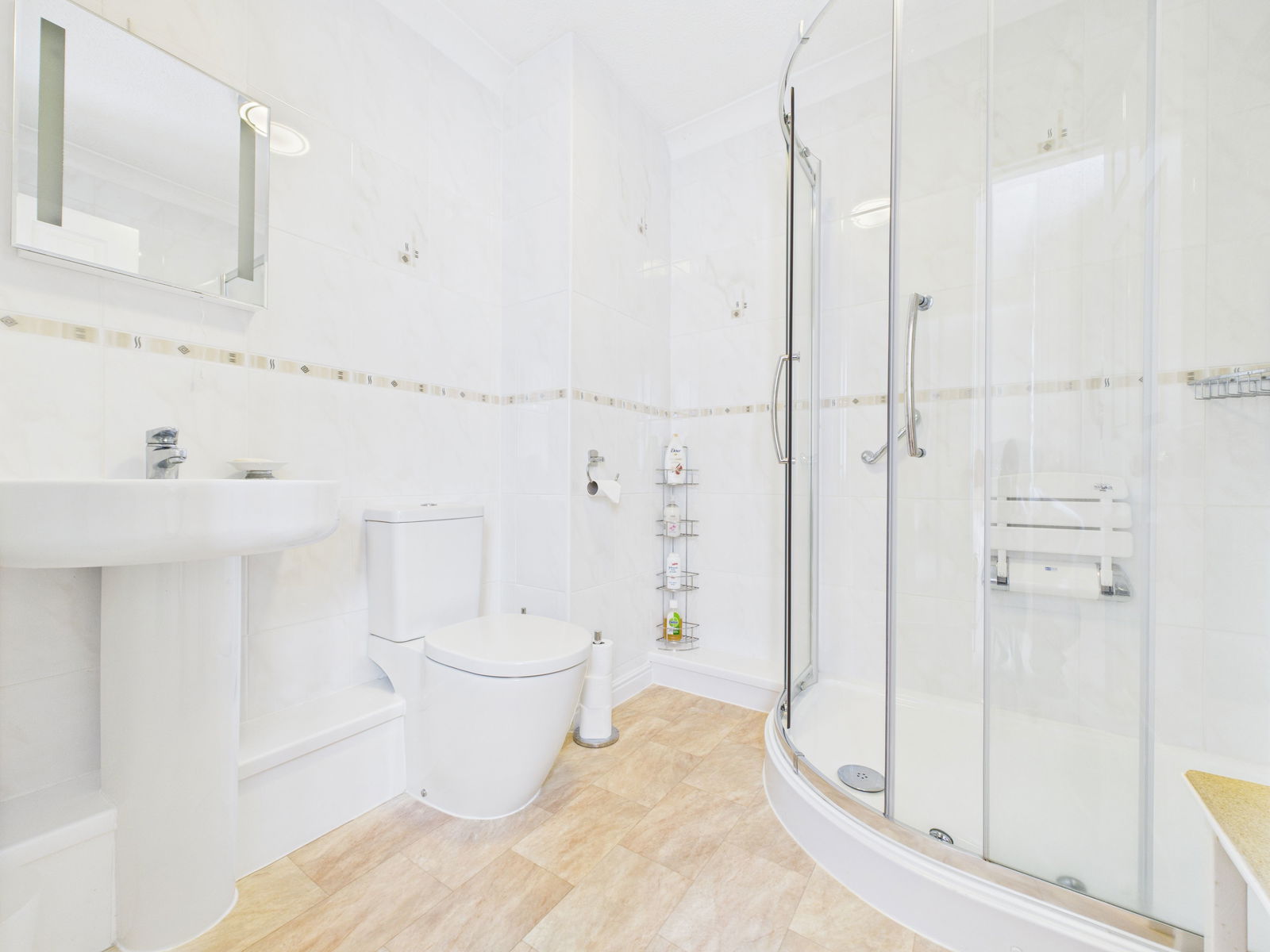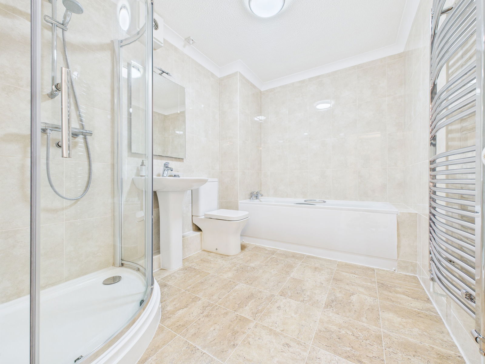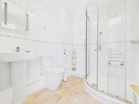 ENSUITE Replaced modern suite comprising corner shower cubicle, pedestal wash hand basin, low level w.c. Fully tiled. Chrome heated towel rail.
