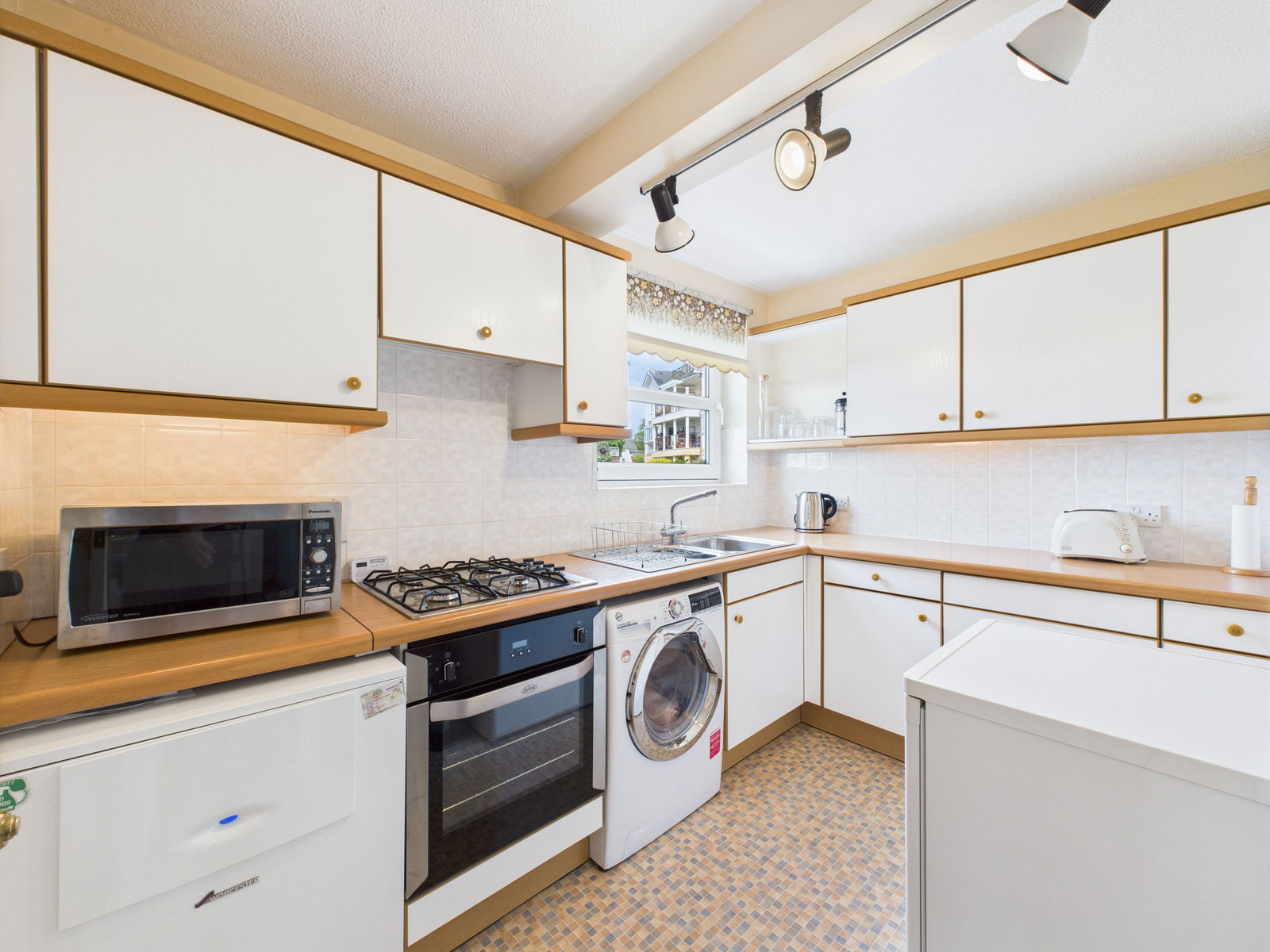KITCHEN - 3.1m x 2.2m (10'2" x 7'2") Range of fitted wall and base units with integral gas hob with oven below. uPVC double glazed window with lake views.