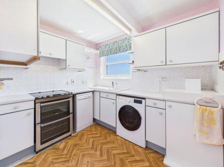 KITCHEN A sizeable kitchen featuring a range of overhead, base and drawer units with roll edged work surfaces above. A 1 1/2 bowl sink and drainer unit, an electric cooker with extractor above, space and plumbing for a washing machine, slimline dishwasher and fridge freezer. UPVC double glazed window with phenomenal sea views.