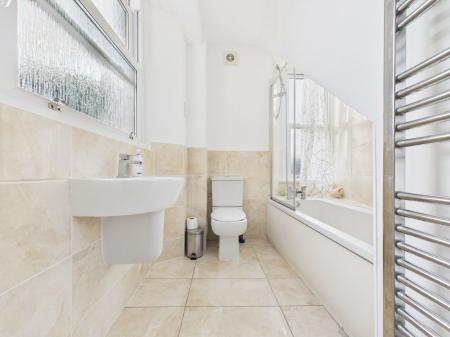 FAMILY BATHROOM A contemporary bathroom suite comprising a panelled bath with overhead shower and protective glass screen, a wall mounted wash hand basin and low level flush WC. Finished with modern tiling, uPVC obscure double glazed windows and a chrome heated towel rail.