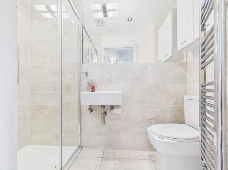 EN-SUITE SHOWER ROOM A stylish and modern en-suite featuring a walk in double shower unit, wall mounted wash hand basin and low level flush WC. Complemented by contemporary tiling, extractor fan and chrome heated towel rail.