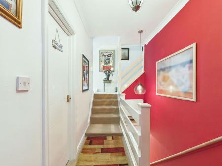 ENTRANCE A fire safety front door opens into a welcoming entranceway with stairs rising to the first floor landing and doors leading to the adjoining rooms. The space is complemented by overhead pendant lighting and an electric storage radiator.