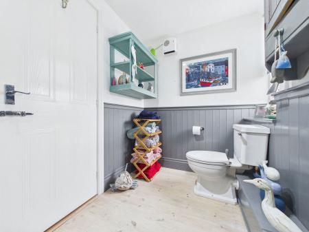 BATHROOM A beautifully presented, nautical inspired bathroom comprising a low level flush WC, pedestal wash hand basin, and panelled bath with shower attachments above and glass shower screen. Finished with panelled walls, an obscure single glazed window, extractor fan, and chrome heated towel rail.