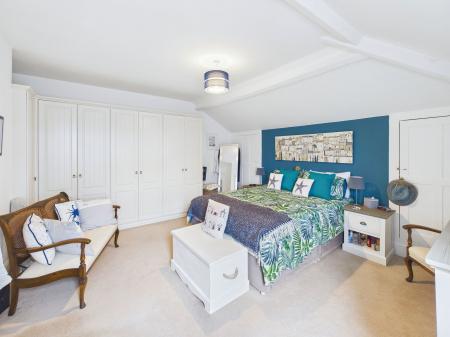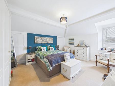 BEDROOM ONE An impressively sized and light filled master bedroom providing ample space for bedroom furniture. The room benefits from built in wardrobes, two additional storage cupboards, single glazed windows, and an electric radiator.