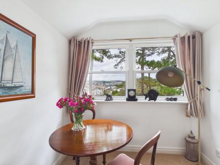 LIVING ROOM / DINING AREA An exceptionally spacious lounge/diner ideal for both relaxing and entertaining, enjoying attractive sea views across to Torquay. The room offers generous space for furnishings, TV and internet points, two large cupboards providing access to loft storage which is currently boarded, double glazed windows, Velux windows capturing the outlook, and two electric storage radiators.