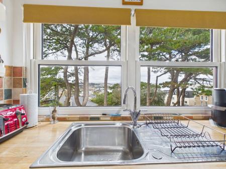 KITCHEN A contemporary fitted kitchen featuring a range of wall, base and drawer units with solid wood surfaces above. The kitchen is equipped with a 1 bowl stainless steel sink and drainer, electric double oven with grill, and a four ring electric hob with extractor hood over. Further benefits include an integral dishwasher, space and plumbing for a washing machine and fridge freezer, tiled splashback, and room for a breakfast table. Double glazed windows provide natural light with sea views over Torbay, while an archway leads to a useful walk in pantry area offering excellent additional storage.
