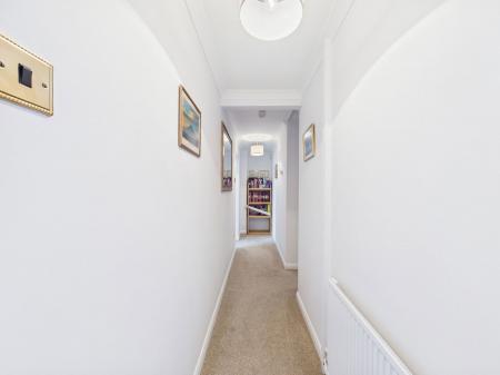 HALLWAY A wide and inviting hallway offers access to the principal rooms, with stairs leading down to the lower ground floor. Overhead lighting, a gas central heating radiator, and a neatly concealed cupboard housing the meters and fuse box.