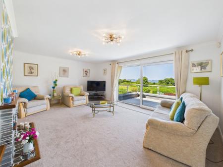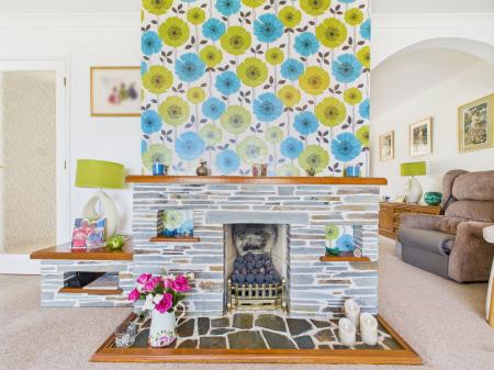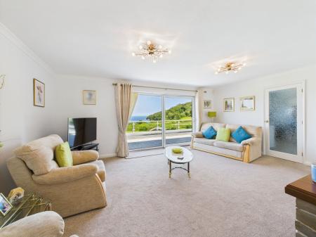 LIVING ROOM A truly exceptional, light-filled living room boasting breathtaking, uninterrupted views over Elberry Cove. Generously proportioned to accommodate a variety of furnishings, it features a gas fireplace with stone surround, two gas central heating radiators, and uPVC double glazed sliding patio doors that open onto a large sun terrace perfect for indoor-outdoor living. An open archway connects seamlessly to the