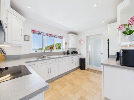 KITCHEN A well appointed and generously sized kitchen offering a comprehensive range of wall, base, and drawer units with roll edged worktops. Featuring a 1½ bowl composite sink with drainer, integrated eye level electric double oven with grill, four ring ceramic hob with extractor, built in fridge and dishwasher, and a deep airing cupboard. A uPVC double glazed window frames idyllic views of Elberry Cove.