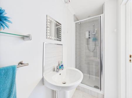 SHOWER ROOM A contemporary shower room featuring a walk in shower, pedestal wash basin, low level WC, extractor fan, and gas central heating radiator.