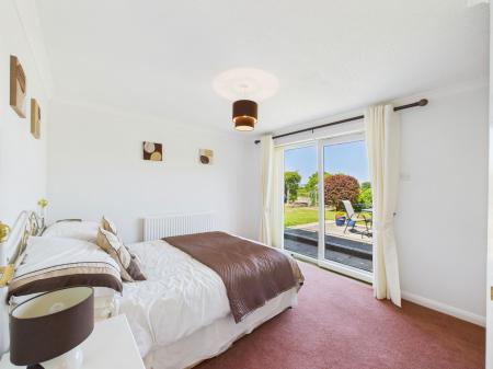BEDROOM ONE A stunning master bedroom with picturesque views of the garden and out to sea. This tranquil space offers ample room for furnishings, uPVC double glazed sliding patio doors, and a gas central heating radiator.