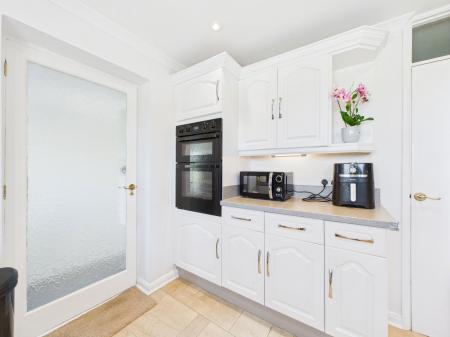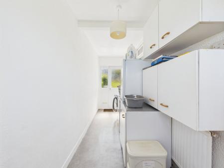 UTILITY ROOM A practical utility room offers space and plumbing for a washing machine, dryer, and fridge freezer. Radiator. Additional base and wall mounted units provide extra storage, while uPVC double glazed doors lead to both front and rear gardens.