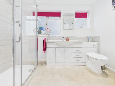 SHOWER ROOM A stylish and modern family shower room, complete with walk in triple shower enclosure, vanity unit with wash basin and storage below, low level WC, tasteful tiling, obscure glazed windows and a gas central heating radiator.