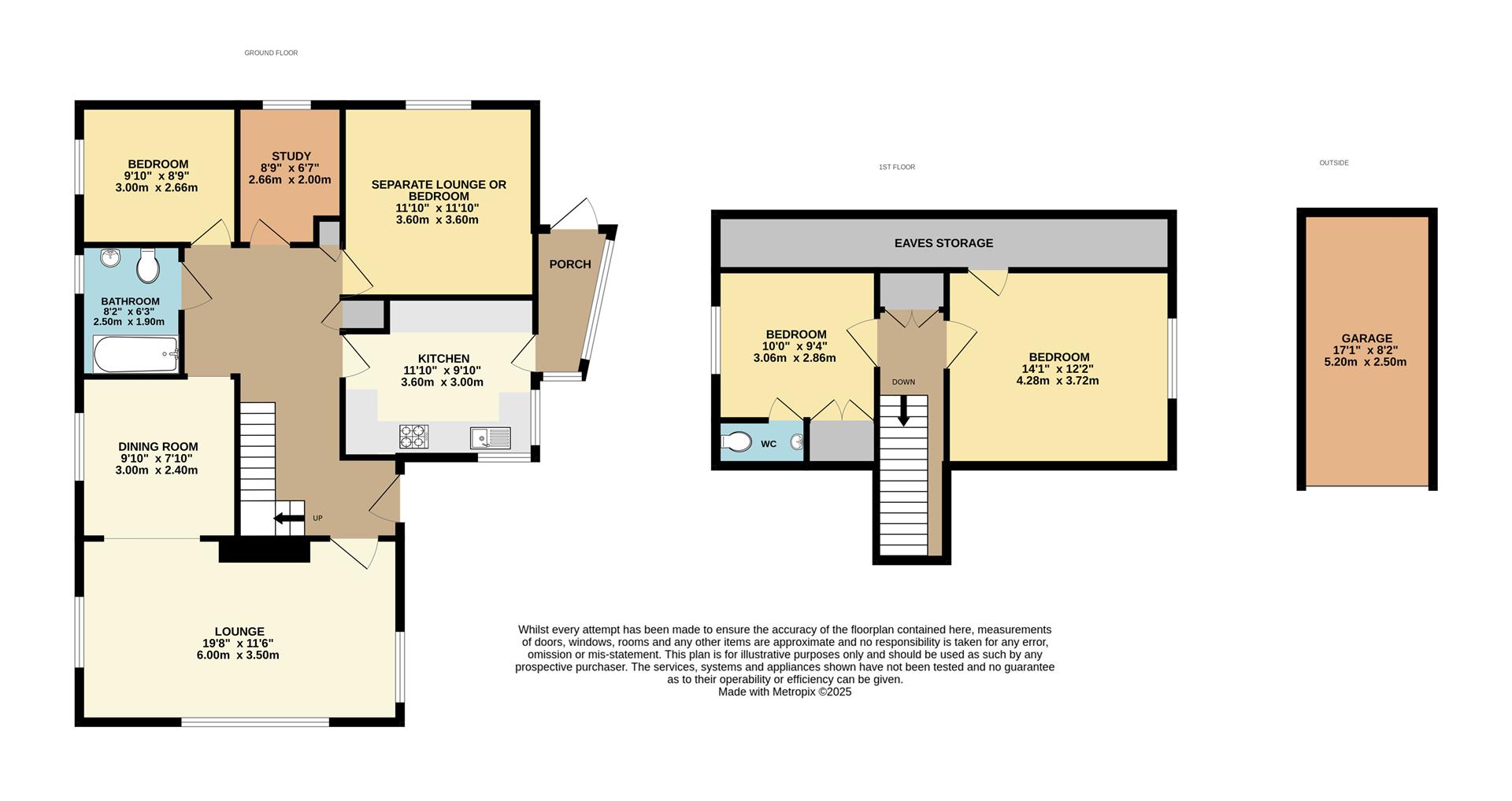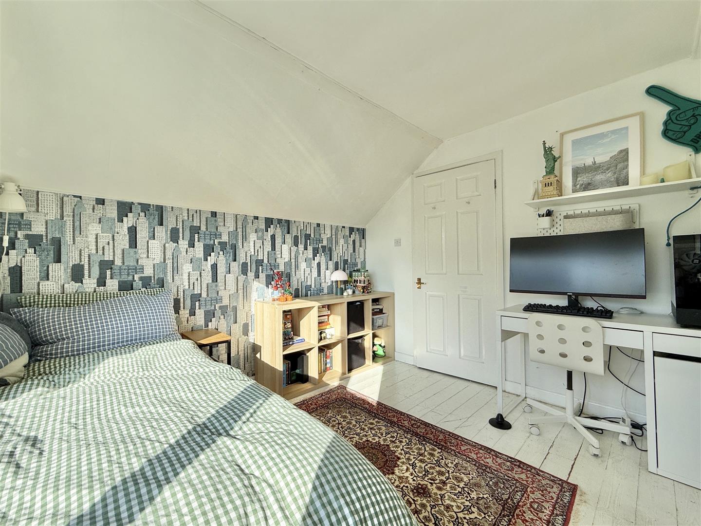 Upstairs, there are two generous double bedrooms, one particularly spacious with elevated south-facing views. The second bedroom offers excellent built-in storage and an ensuite WC. Additional eaves storage runs the full width of the home, providing ample practical space.