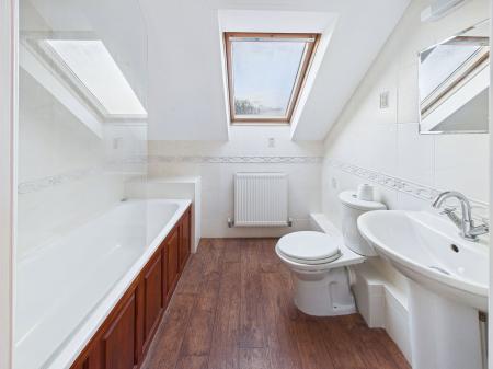 BATHROOM A well proportioned family bathroom complete with a low level WC, pedestal wash basin and a panelled bath with overhead shower attachments. Finished with tiled walls, a Velux window and a gas central heated radiator.