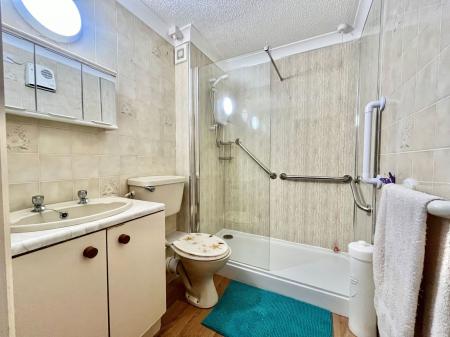 SHOWER ROOM A sizeable shower room boasting a three piece suite of a low level flush WC, a vanity wash hand basin with fitted storage below and a walk in triple shower unit. Tiled walls, extractor fan and a wall mounted mirror fronted medicine cabinet.