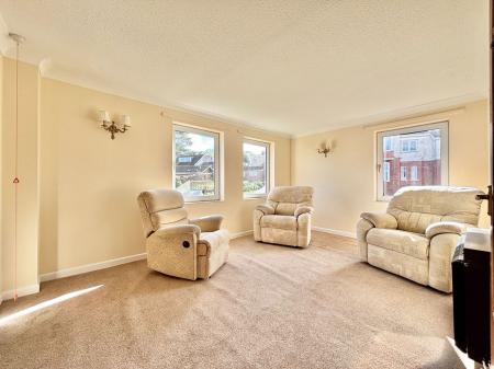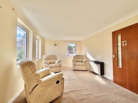 LOUNGE - 4.88m x 3.38m (16'0" x 11'1") A large and sun soaked living room with double aspect double glazing overlooking the communal gardens. Tv and internet points, an electric night store heated radiator and an archway leading into