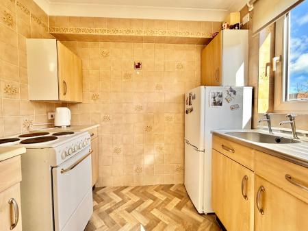 KITCHEN - 2.36m x 1.63m (7'9" x 5'4") A fitted kitchen comprising a range of overhead, base and drawer units with roll edged work surfaces above. A 1 bowl stainless steel sink and drainer unit, an electric cooker, and space for a fridge freezer. Tiled walls and a uPVC double glazed window.