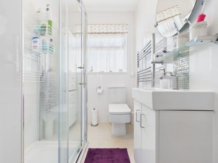 SHOWER ROOM A contemporary shower room comprising a low level flush WC, vanity wash basin with storage beneath and a walk in shower. Finished with modern tiling, a chrome heated towel rail and an obscure uPVC double glazed window.