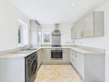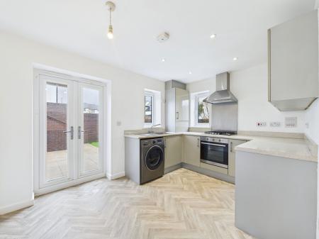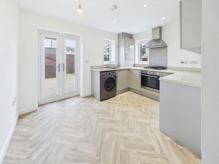 KITCHEN/DINER A contemporary kitchen/diner fitted with a comprehensive range of wall, base and drawer units complemented by roll edge work surfaces. Appliances include a 1 bowl stainless steel sink with drainer, an integrated electric oven with grill and a four ring gas hob with extractor hood above. There is space and plumbing for a washing machine and fridge, along with a cupboard housing the boiler. uPVC double glazed windows and French doors provide access to the garden and a gas central heated radiator.