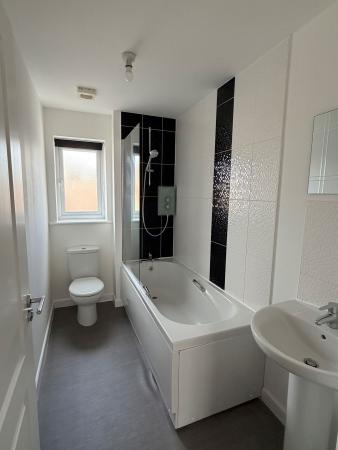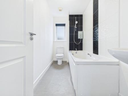 BATHROOM A spacious and modern family bathroom comprising a low level WC, pedestal wash hand basin and a panelled bath with shower over and glass shower screen. Further features include tiled walls, shaver point, extractor fan, uPVC obscure double glazed window and a gas central heating radiator.