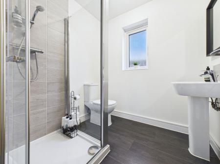 EN-SUITE A walk in shower, w/c, vanity wash basin and heated towel rail. And frosted uPVC double glazed window.