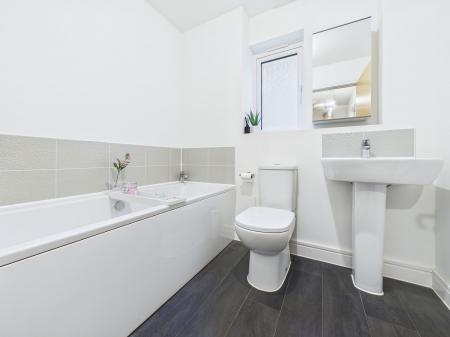 BATHROOM A tiled bathroom featuring a bath, w/c and vanity wash basin along with a uPVC double glazed frosted window.
