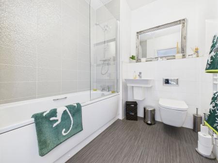 FAMILY BATHROOM A stylish and contemporary bathroom comprising a low flush WC, wall mounted wash hand basin and a panelled bath with shower over and protective glass screen. Finished with complementary wall tiling, extractor fan, shaver point, and a modern white heated towel rail.