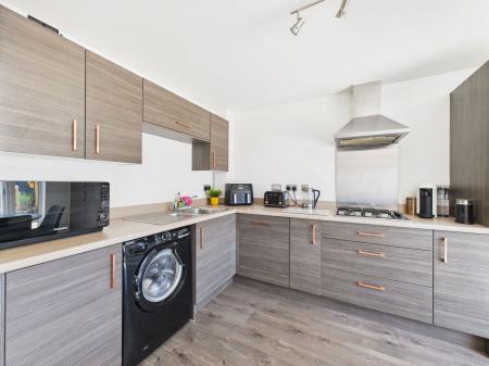 KITCHEN/DINER Designed for modern living and entertaining, this beautifully presented kitchen/diner offers an extensive range of wall, base, and drawer units complemented by roll edged work surfaces. A 1.5 bowl stainless steel sink with drainer, integrated electric double oven and grill, and a four-ring gas hob with extractor hood above are all fitted. Further integrated appliances include a dishwasher and fridge freezer, with plumbing and space for a washing machine. A deep built-in storage cupboard is perfect for pantry use. French doors open out onto the sunny rear garden, and there’s ample space for a 6/8 seater dining table. Finished with a gas central heated radiator and UPVC double glazing